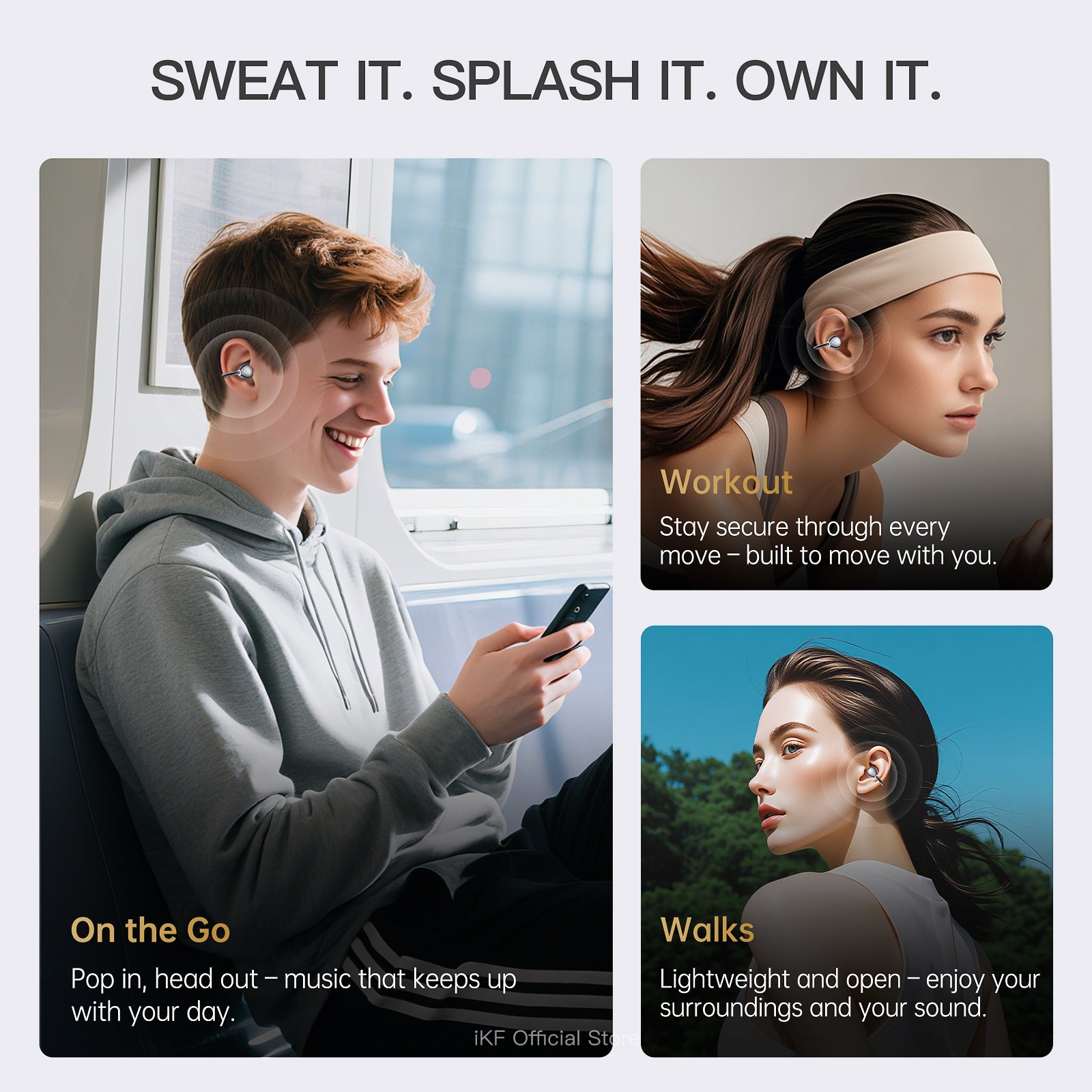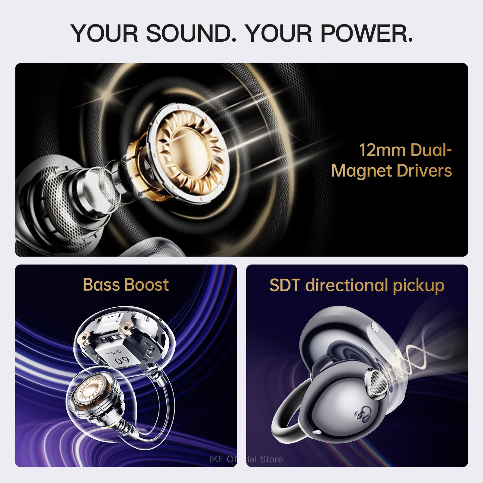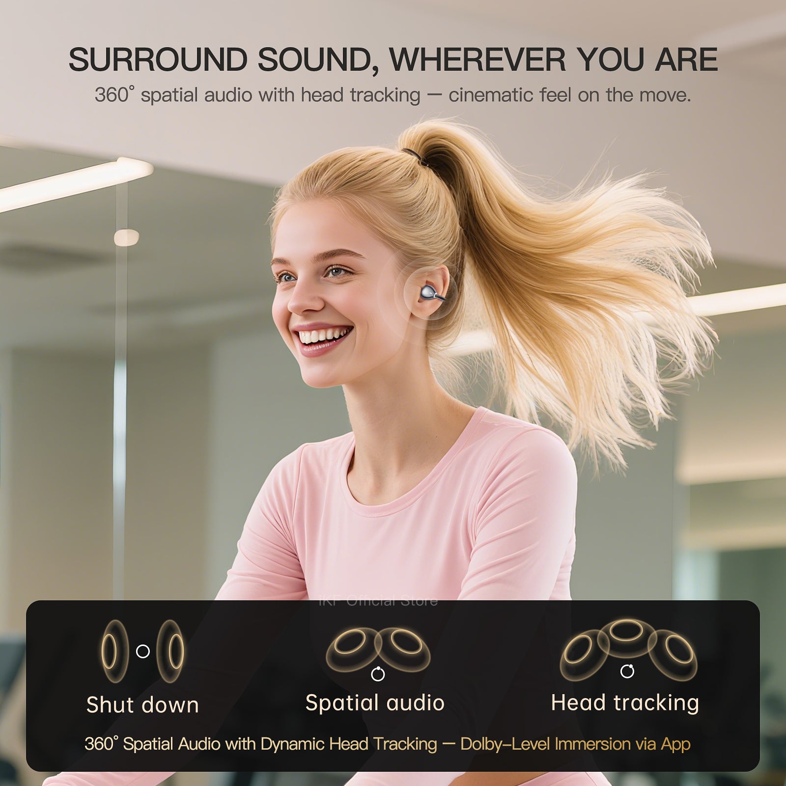 360° Spatial Audio with Head Tracking – Dolby-level immersive experience via iKF App.