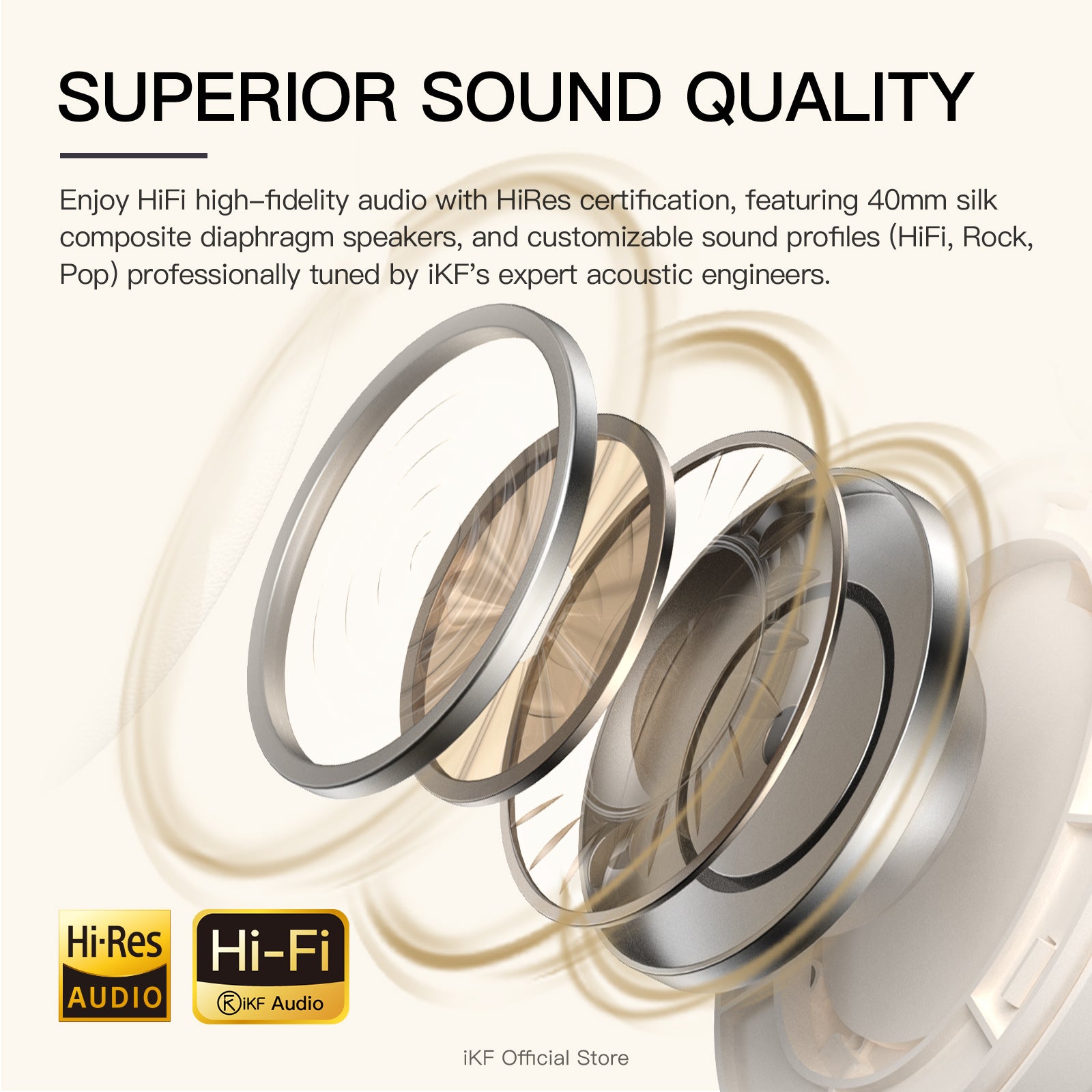 - 【HiFi Lossless Sound Quality + Sound Switching】Using 40MM silk composite diaphragm speakers while built-in specially tuned three personalised sound effects, including HiFi, Rock and Pop, high fidelity lossless sound quality, enjoy a great experience with different sound effects.